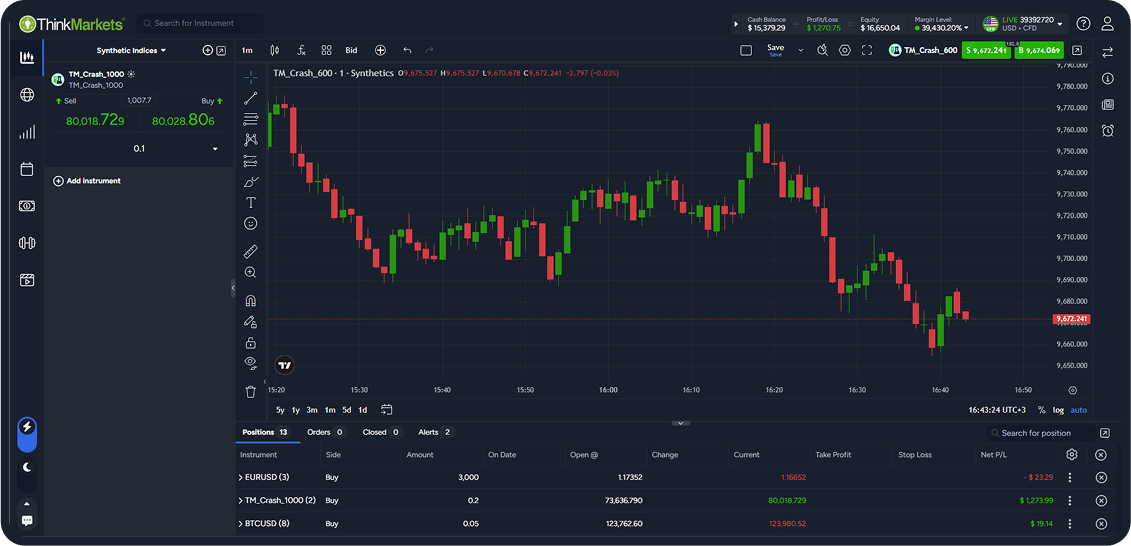 Crash 1000 is a synthetic index designed to model rare but significant downward price movements. Available 24/7 on ThinkTrader and MT5, its price is generated by a cryptographically secure algorithm rather than global financial events.