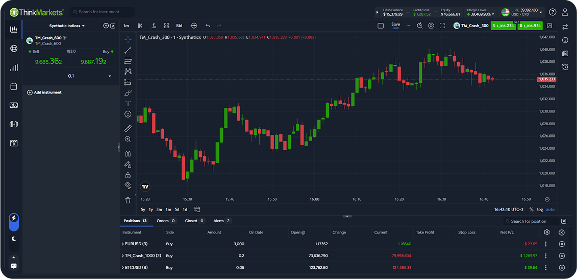 Crash 600 is a synthetic index built to capture programmed downward price moves at a moderate pace. Available 24/7 on ThinkTrader and MT5, its pricing is defined by a secure algorithm rather than real-world market events.